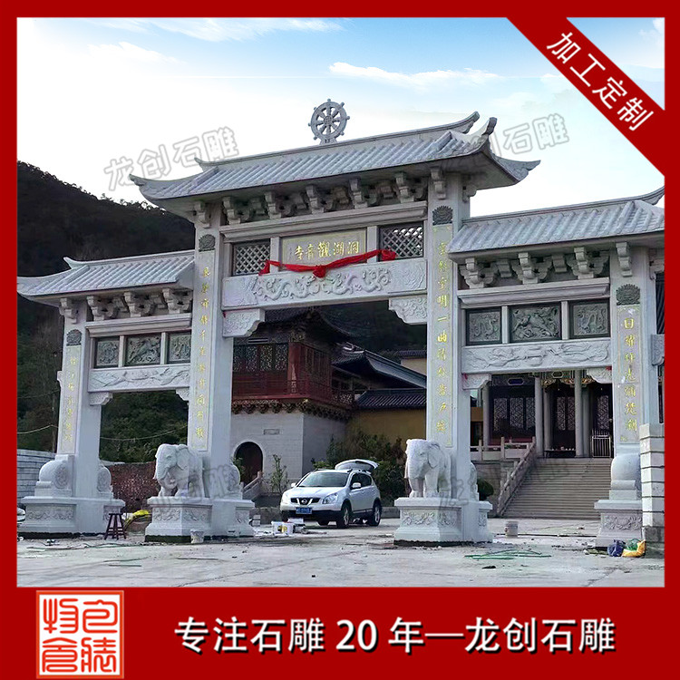 以上分享的石牌樓是中式典型的三門四柱石牌樓造型,作品結構緊密,設計精巧,款式古樸,是古建景區,宗教寺廟,村莊入口常用的景觀擺件。惠安龍創石雕支持定制各種樣式的石牌樓、石牌坊,專注石雕20年,匠心制作,自有礦山,價格實惠。