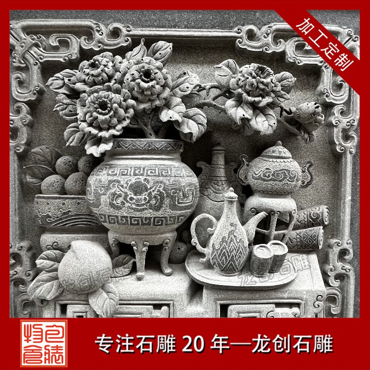 在工藝技法上,這類浮雕注重平面構圖向立體空間的轉(zhuǎn)換。采用寫實與寫意相結(jié)合的表現(xiàn)手法,花朵枝葉的形態(tài)力求準確,而整體布局則講究虛實相生。雕刻時通常分三個層次處理:遠景層淺刻勾勒,中景層適度凸起,近景層重點刻畫。特別是禽鳥的喙眼、花瓣的翻卷、葉片的脈絡等關鍵部位,通過精細的刀工呈現(xiàn)出生動的細節(jié)質(zhì)感,使堅硬的青石呈現(xiàn)出柔美的自然氣息。