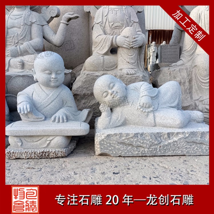 石雕小沙彌擺件造型有做早課晨練的小石雕、有拿著掃把在打掃的小石雕、也有著躺在樹下偷懶的小石雕等等,這些都是根據小和尚這種人物來做成的石雕,也是深受社會上很多人喜歡的。這種石雕的類型在制作上雖然不如一些大和尚石雕那樣莊嚴、慈悲,但是有著屬于他們年齡特點的一些制作雕刻。
